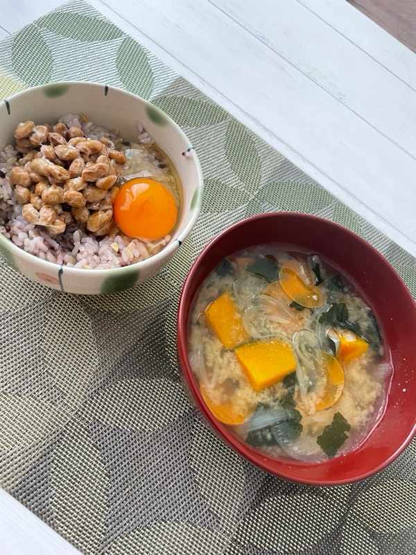 冷蔵庫に残っていたカボチャと玉ねぎと人参を刻んで柔らかく煮た味噌汁を作って、炊き立ての雑穀飯に納豆と卵を落としてよく噛んで食べた。